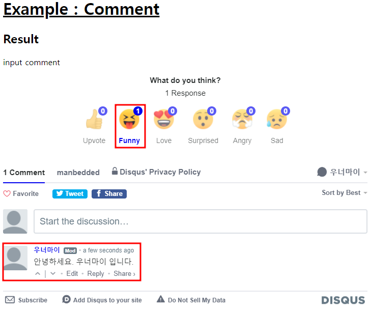 - DISQUS 에서 제공하는 댓글 기능 소스 코드를 이용하여 웹페이지에 적용함.