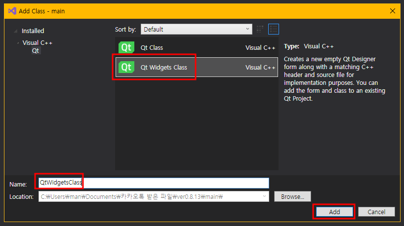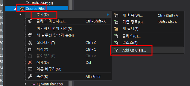 1. 프로젝트에서 생성하고자하는 폴더에서 오른쪽 마우스 클릭 - 추가 - Add Qt Class... 선택
