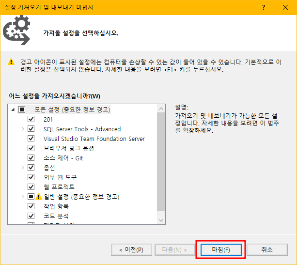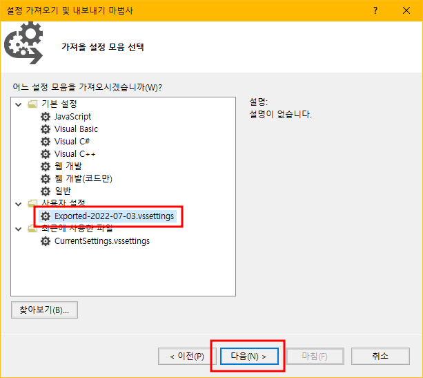 - 설정 가져오기 및 내보내기 메뉴 선택