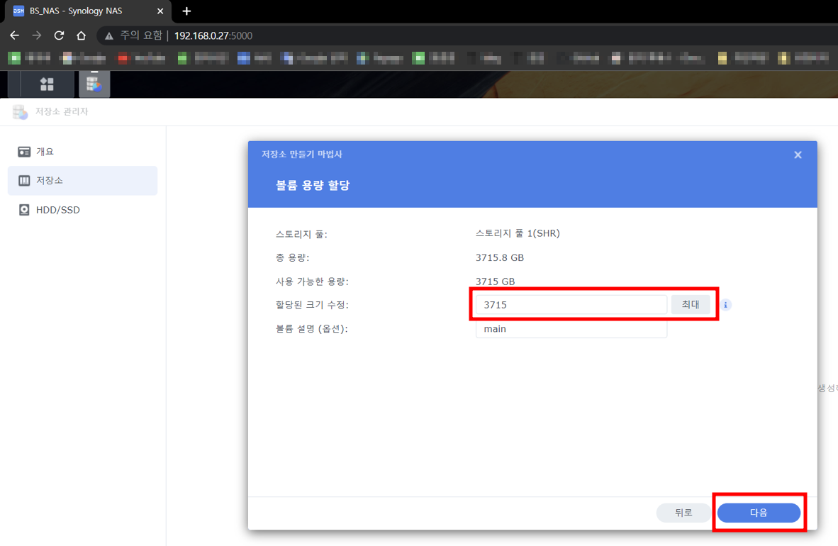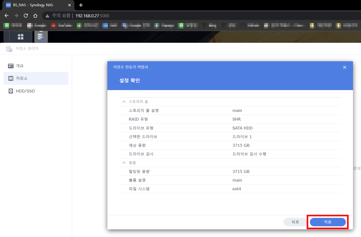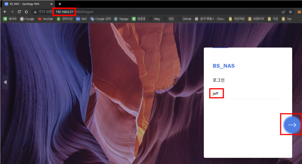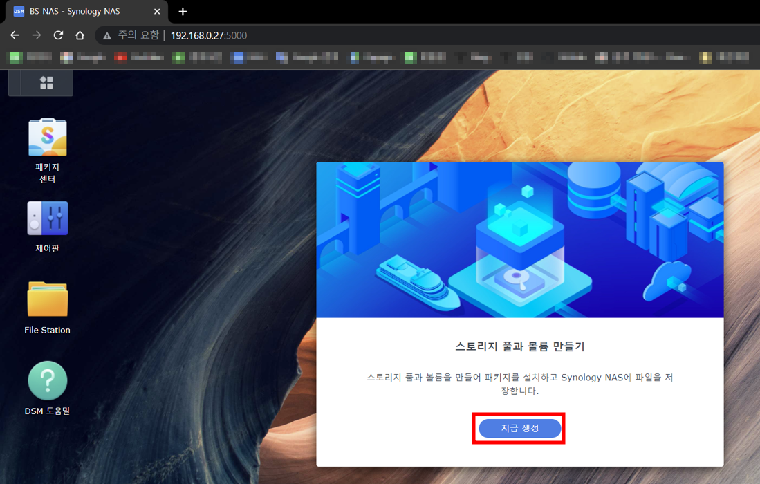 - 3단계에서 (2) 로컬 IP 주소로 홈페이지에 입력 및 접속 시 설치한 시놀리지 나스 운영체제(DSM) 화면 전환