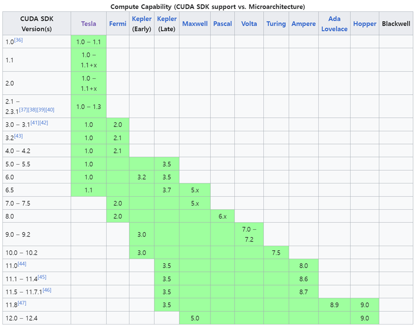 - 아래 그림은 GPU 아키텍처별 지원가능한 CUDA toolkit 버전을 표시하고 있다.