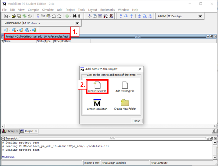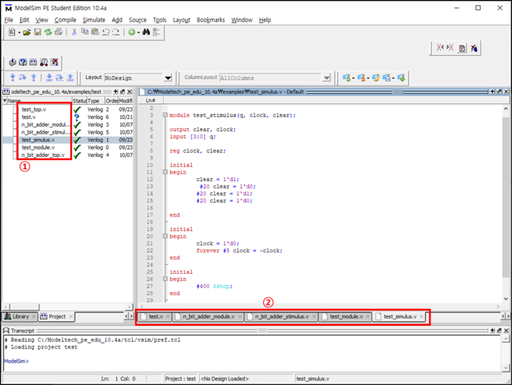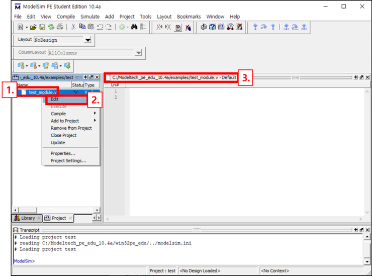 - 해당 파일을 더블클릭 또는 Edit을 누르시면 2번과 같이 ModelSim 안에 에디팅 창이 나타납니다.