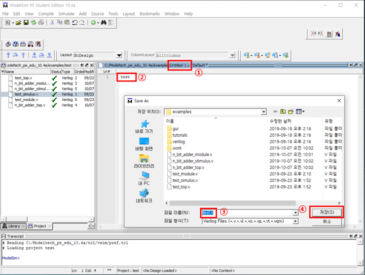 - 3번은 파일명을 저장합니다. Verilog 파일이므로 뒤에 확장자명은 .v 로 하겠습니다.