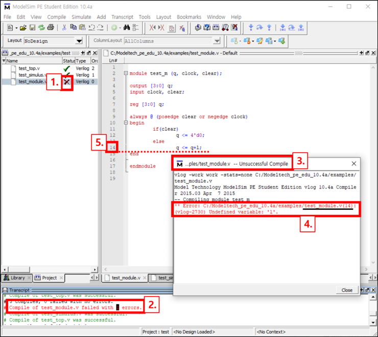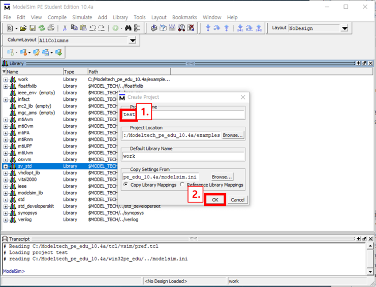 - 해당 파일을 더블클릭 또는 Edit을 누르시면 2번과 같이 ModelSim 안에 에디팅 창이 나타납니다.