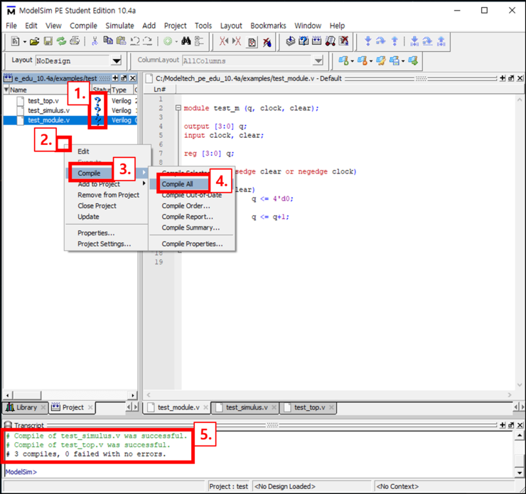 | [ModelSim/Verilog] 프로젝트 생성, 에디팅, 컴파일, 시뮬레이트 (0) | 2019.09.23 |