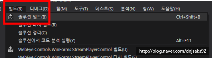 프로젝트 카테고리 메뉴 -> 빌드 -> 솔루션 빌드