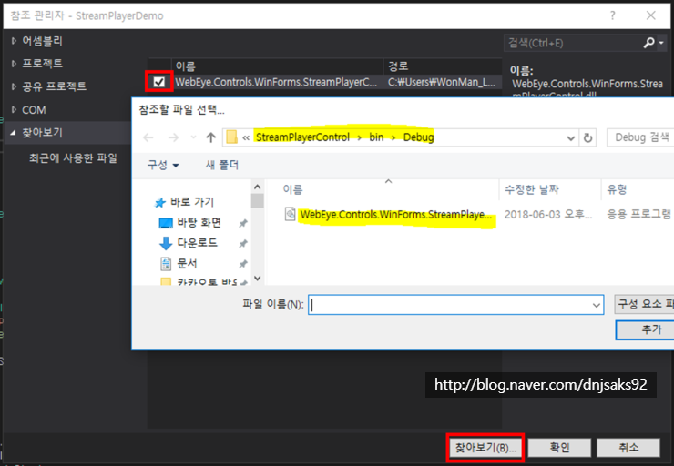 아까 빌드한 프로젝트 파일의 .dll 을 다시 참조하기 위해 경로를 잡도록 하겠습니다.