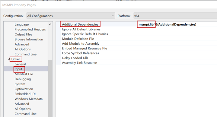 - Linker → Input → Additional Dependencies → msmpi.lib 입력