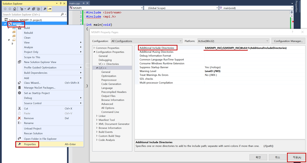 - C/C++ → General à Additional Include Directories → $(MSMPI_INC);$(MSMPI_INC)\x64 입력 (64-bit)