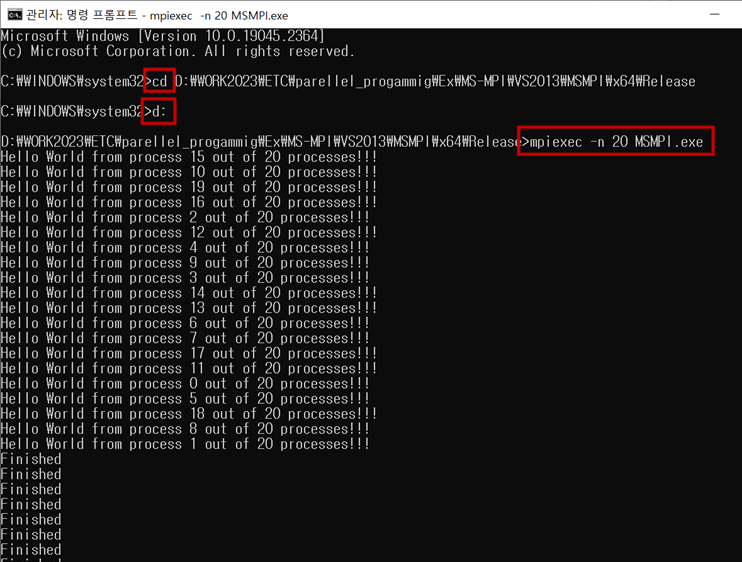 - $ mpiexec –n 20 MSMPI.exe 입력