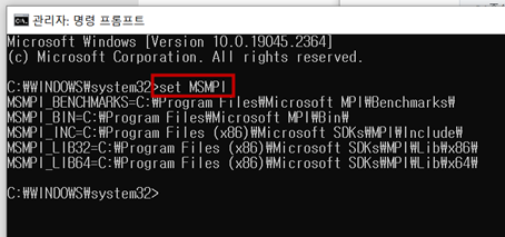2) 환경 변수 확인 : 명령프로프트 관리자 권한으로 실행 (set MSMPI 입력)