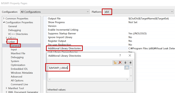 - Linker → General → Additional Library Directories → $(MSMPI_LIB64) 입력 (64-bit)